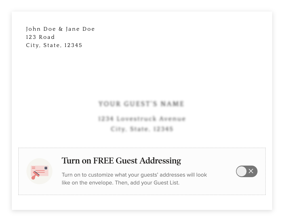 Within your draft, click the Envelope tab. From here, click "Add Guest Addresses", and follow the prompts to add guest addressing! Be sure to click "Save Personalizations" to ensure that all of your addresses print. Keep in mind that only guests set as "Definitely Invited" will be available to add to your guest addressing.