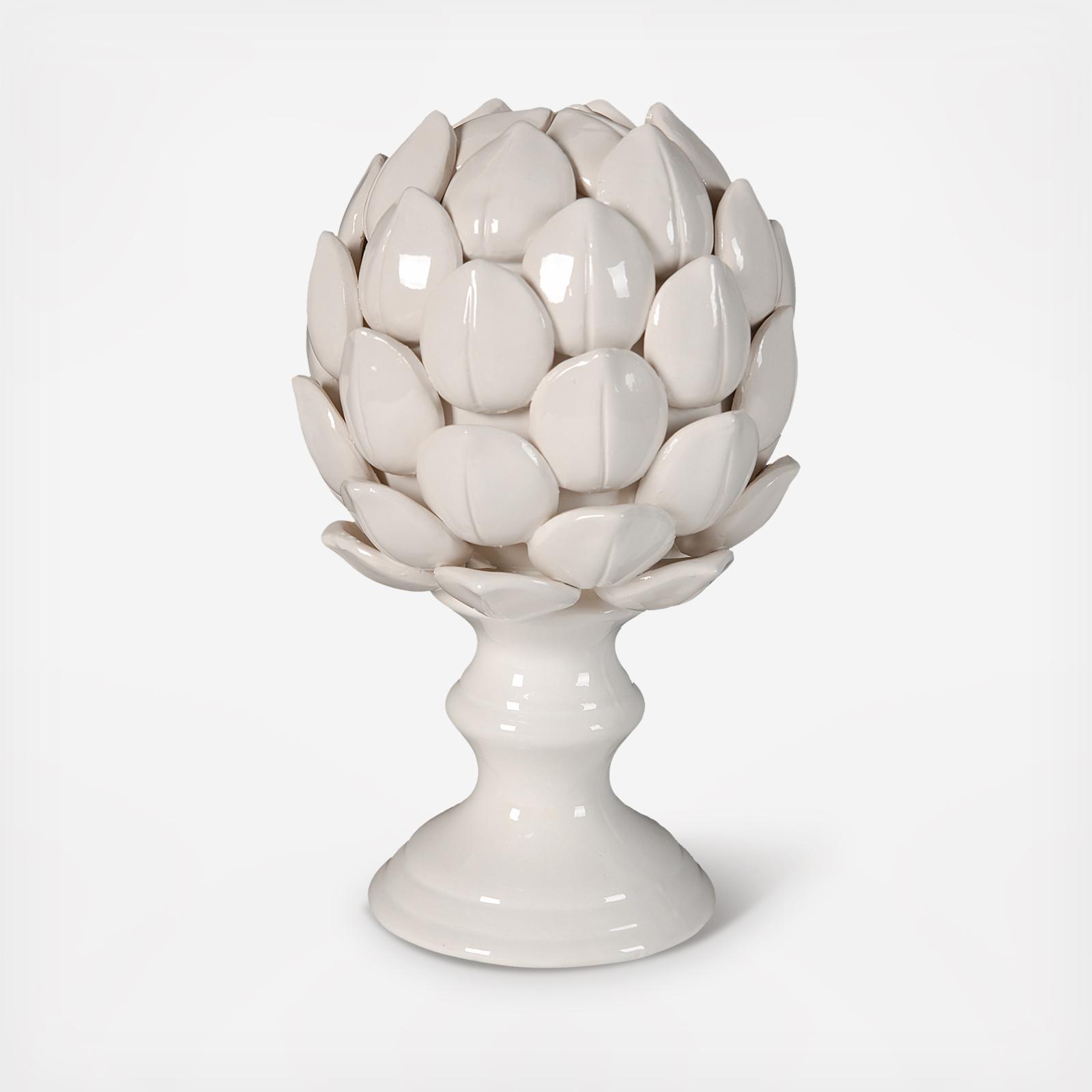 As artichokes have a surprisingly long history in architecture and décor, this lovely figure offers a modern take on a timeless motif. Every detail shines brightly in this white porcelain design and the play of light and shadow across the glossy surface brings this piece to life. This large figure stands at 10 in. tall, perfect for displaying on a mantle or countertop.