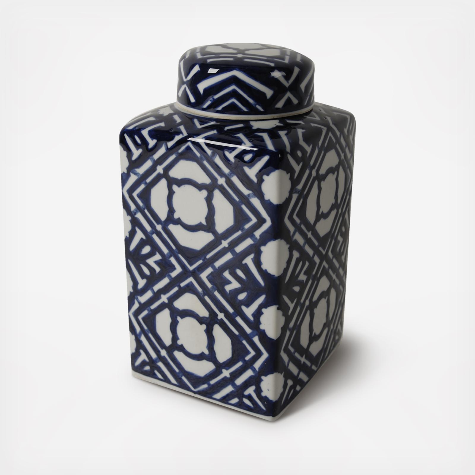 Featuring a deep blue pattern atop a crisp white background, the Valora Blue and White Square Lidded Jar features a simple-yet-bold look. The jar adds a breath-taking touch of global flair. Feature this vase on a mantle or shelf, or fill will decorative branches or flowers for a dramatic look on a entryway table, kitchen island, or master bedroom.
