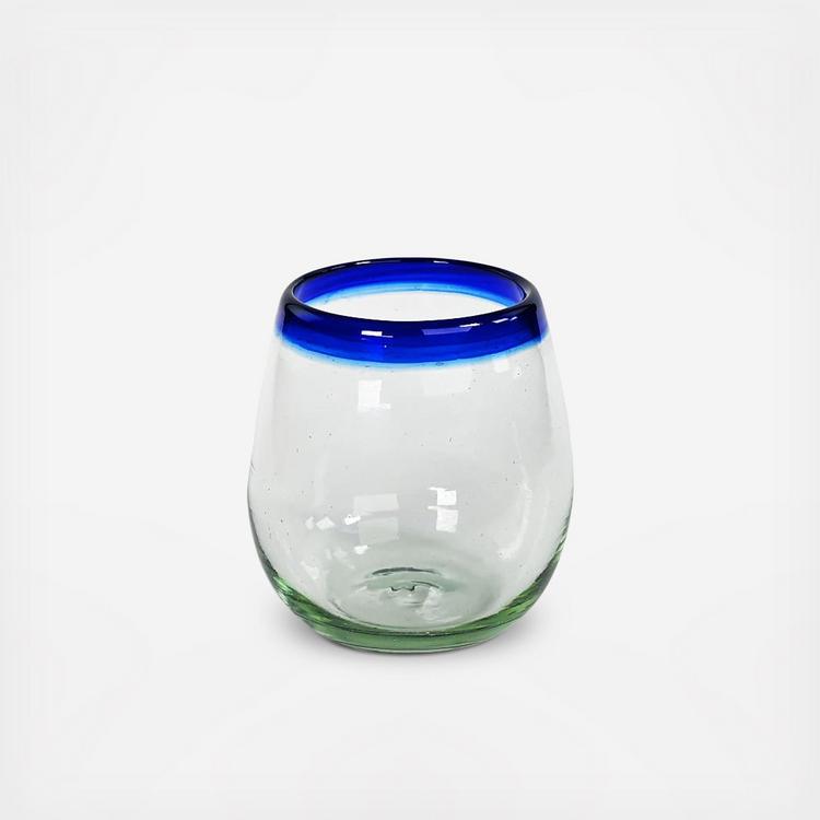 Experience the perfect blend of form and function with the Artisan Glassware Stemless Wine Glass, Set of 4. Intricately handcrafted in Mexico, each piece represents a fusion of timeless design and innovation. The striking aqua rim adds a tranquil touch to any table setting, captivating eyes and elevating events. Our stemless wine glass manifests sustainability, being crafted from carefully sourced recycled glass. It offers a balanced grip for an enjoyable wine-drinking experience. This piece, inspired by the aqua hues of beach resorts, makes every sip an occasion.