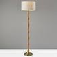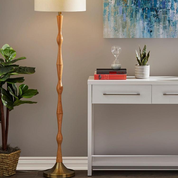 Update your space with a touch of modern bohemian style with the Eve Floor Lamp. The lamp body is made up of a oak wood, a durable material that reveals an attractive wood grain. A tapered antique brass metal base provides a decorative accent while also keeping the lamp strong and sturdy. An off- textured fabric drum shade is the perfect compliment to these soft toned wood and metal materials. A simple on/off switch is located on the socket which is made to house up to 100 Watts.