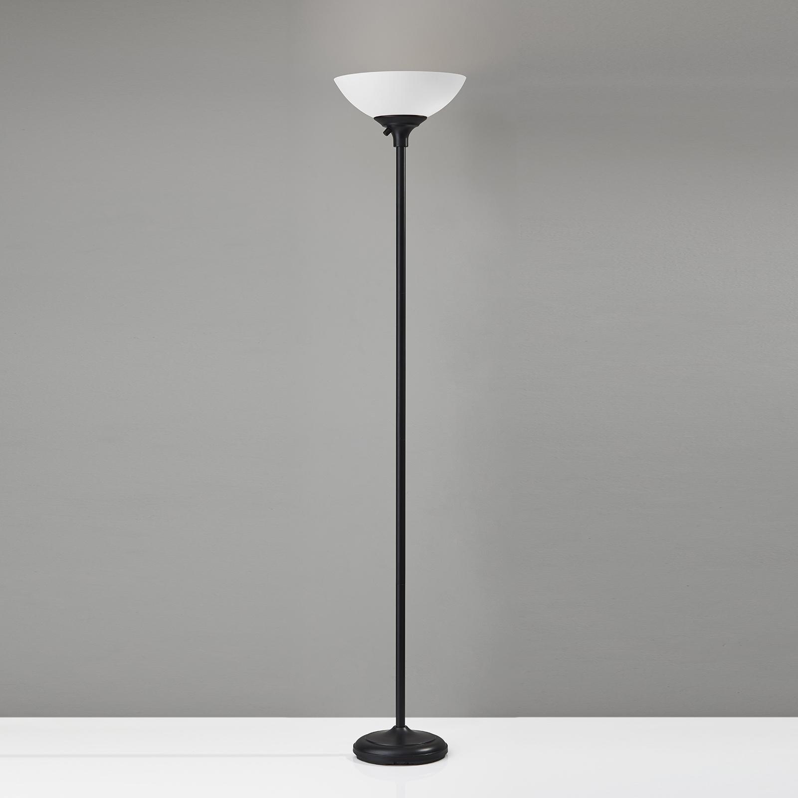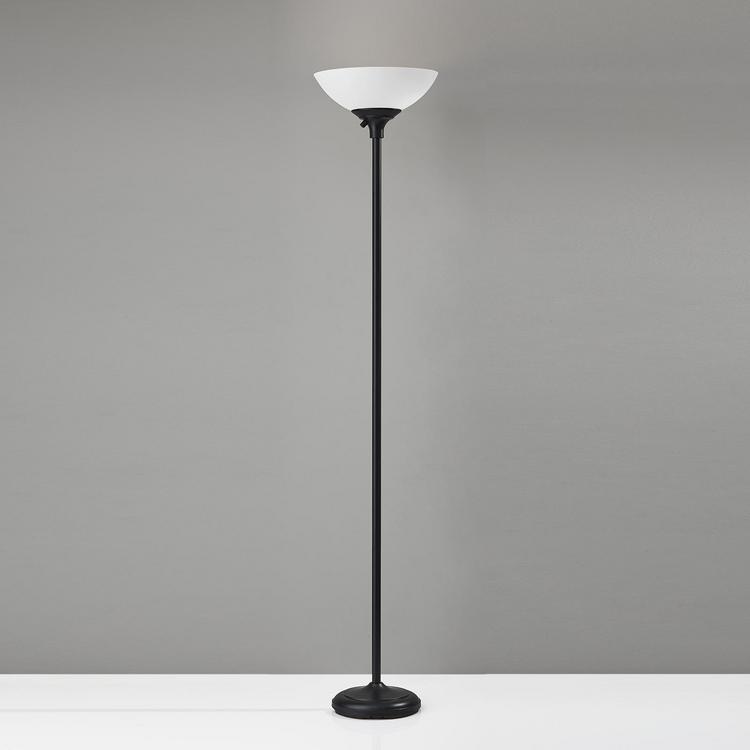 A simple, classic style, the Glenn 300 Watt Floor Lamp is easily placed into a variety of décor and spaces. A finished pole extends into a frosted plastic bowl shade that reveals a beautful glow when lit. An Adesso patented 300 Watt Double Socket construction allows for two criss-crossed sockets, each holding on/off 150 Watt incandescant bulbs or equivalent CFL's, which provides approximately 3 times more light than a typical torchiere using a 150 Watt 3-way bulb and illuminates an entire room. A 3-way rotary socket switch is located on the socket. The 3-way rotary socket switch will only work with a 3-way light bulb, otherwise this lamp will function with simple on/off switch at its highest setting. This floor lamp is smart outlet compatible. Bulb is not included.