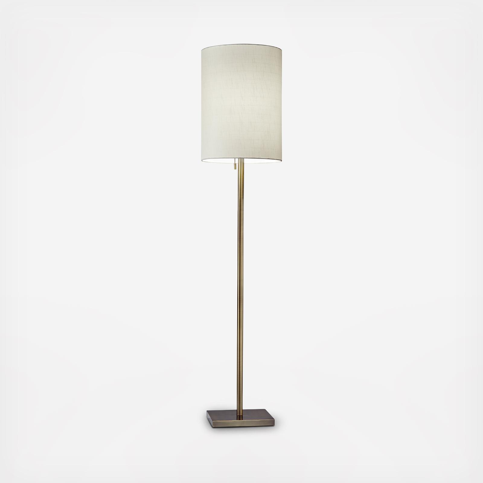The Liam Floor Lamp is an elegant style that highlights simple materials and a classic silhouette. A thick metal pole supports textured fabric shade. A tall cylinder shade is contrasted by a compact square shaped metal base. A simple pull chain turns the lamp on and off. A subtle clear cord trails out from the base. Place this floor lamp in your living room for a soft, modern look.