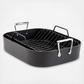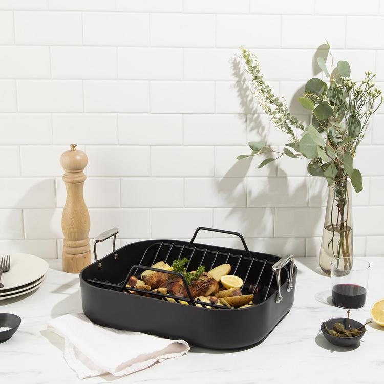 Meat, poultry, and vegetables can be roasted to perfection with the All-Clad HA1 Hard Anodized nonstick roaster. The heavy-duty roasting pan features tall, straight sides, which help prevent splatters and spills. Its upright handles ensure a secure hold when transporting the pan to and from the oven. The roaster’s V-shaped nonstick roasting rack elevates large cuts of meat to promote even heating (plus it makes it easy to collect natural juices from the pan's bottom, for basting, glazing, or gravy-making). Three layers of PFOA-free nonstick coating ensure effortless food release and make cleanup a breeze. Even more, this nonstick cookware offers superior heat conductivity and wrap-resistant strength with dishwasher-safe convenience.