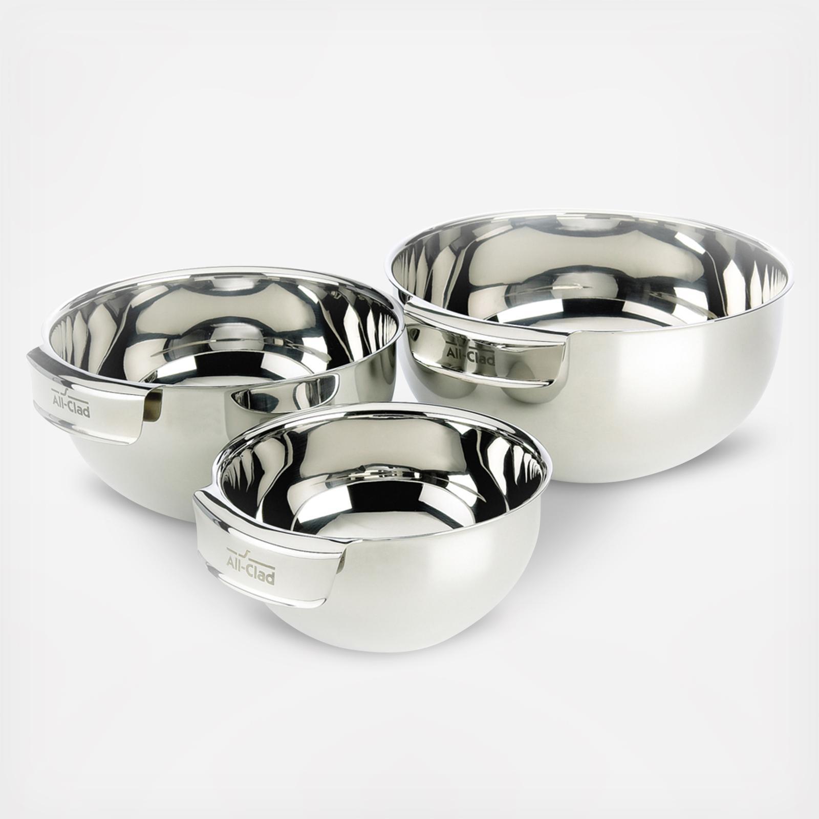 The three sizes offered in the mixing bowl set cover all your needs in the kitchen, from mixing batters and dressings to tossing salads and incorporating dough. Rolled rims facilitate easy pouring. Integrated handle provides for a secure grip, and can be used as a double boiler, with the handle resting over a pan's edge.