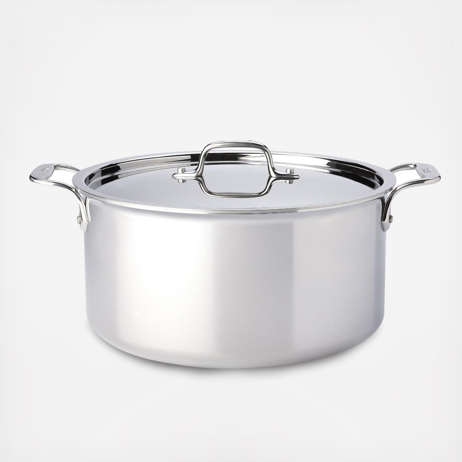 An essential for every kitchen and available in a variety of sizes, the All-Clad Stainless 8-quart stockpot features high sides that slow the evaporation of liquids, providing the ideal design for creating a variety of stocks. The wide bottom of the pan allows for sauteing of ingredients before the addition of liquids for delicious soups and stews. Stockpots are also well-suited for canning, blanching, and preparing food in large quantities.