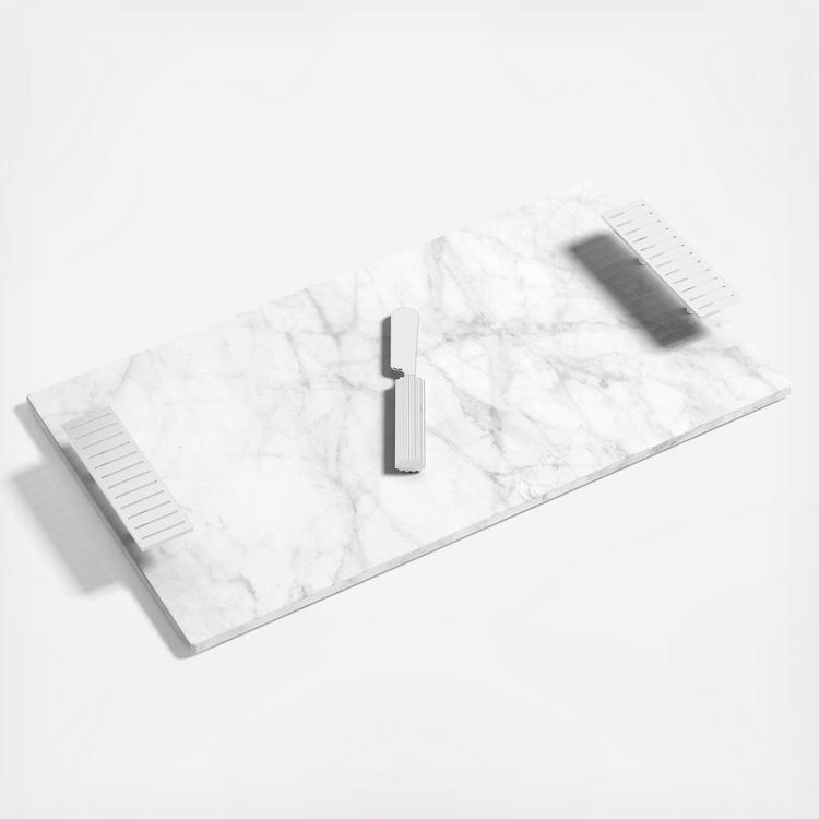 Our Striations Cheeseboard & Knife Set blends timeless design with modern functionality. Crafted from sleek stainless steel, its design is inspired by the natural beauty of sunlight filtering through trees and the tranquil patterns of glacial grooves. This versatile and pragmatic set works equally well as a cheeseboard, a display of hors d’oeuvres or crudité, or even a challah board.