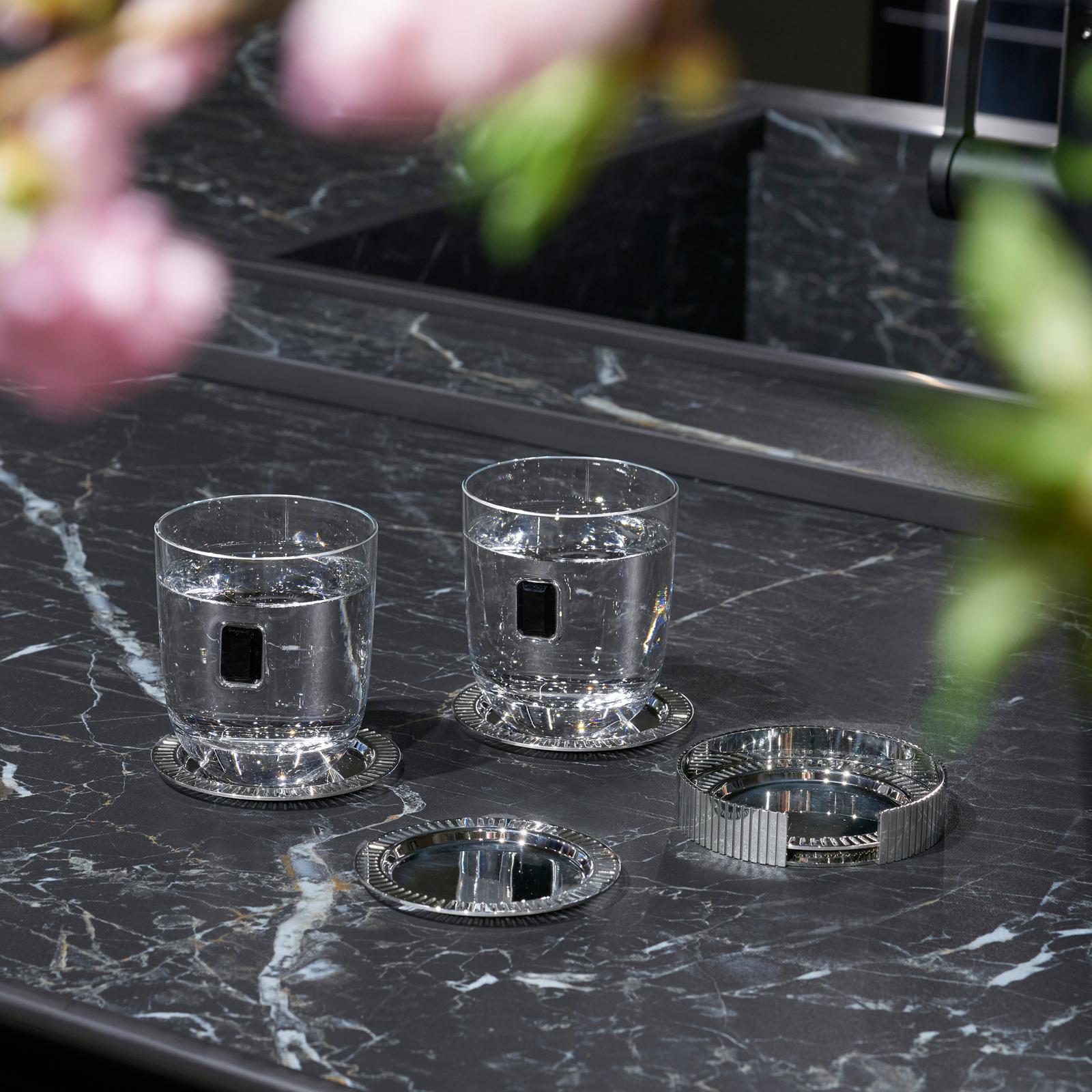 Introducing the Striations Coasters, where timeless design meets modern functionality. Crafted from durable stainless steel, its sleek design is inspired by the graceful lines of nature, echoing the serene lines of beams of sunlight through trees and glacial landscapes in its intricate patterns. This set of four coasters not only adds sophistication to your table but also protects it, showcasing unique patterns created by the interplay of light through its striations, and making every gathering a visual delight.