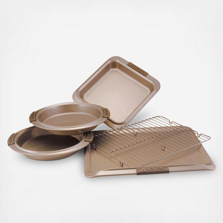 Finally, exceptional bakeware for dedicated bakers. Designed to deliver great baking results with both ease and efficiency, this Anolon Advanced Bronze Non-Stick Bakeware Set provides a fundamental assortment of cake pans and baking sheets that measure up to the high standards of dedicated bakers. Versatile, dishwasher safe cake pans and cookie sheets are ideal for roasting brussel sprouts, baking blondies, crafting signature baked goods, and everything in between. Non-Stick cooling rack elevates your sweet and savory creations to cool to desired perfection. Oven safe to 450°F, these Non-Stick pans are crafted from heavy gauge steel to resist warping and feature a beautiful bronze color tone that promotes browning and helps deliver the even heat distribution necessary to successful baking. This product contains (Este producto contiene) PTFE (PFAS). For more information on PFAS or chemicals in this product, visit (Para obtener mas informacion sobre PFAS o productos quimicos en este producto, visite) anolon.com/pages/product-disclosures.