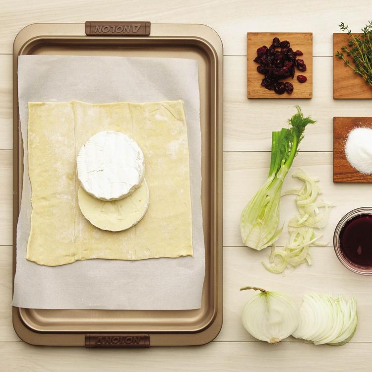 Featuring a shallow rim for even more baking versatility, the Anolon Advanced Bronze Nonstick Bakeware Nonstick Cookie Pan with Silicone Grips is designed to make baking easier and more efficient, and measure up to the high standards of serious bakers. This product contains (Este producto contiene) PTFE (PFAS). For more information on PFAS or chemicals in this product, visit (Para obtener mas informacion sobre PFAS o productos quimicos en este producto, visite) anolon.com/pages/product-disclosures.