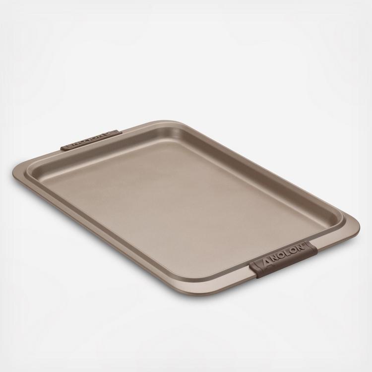 Featuring a shallow rim for even more baking versatility, the Anolon Advanced Bronze Nonstick Bakeware Nonstick Cookie Pan with Silicone Grips is designed to make baking easier and more efficient, and measure up to the high standards of serious bakers. This product contains (Este producto contiene) PTFE (PFAS). For more information on PFAS or chemicals in this product, visit (Para obtener mas informacion sobre PFAS o productos quimicos en este producto, visite) anolon.com/pages/product-disclosures.