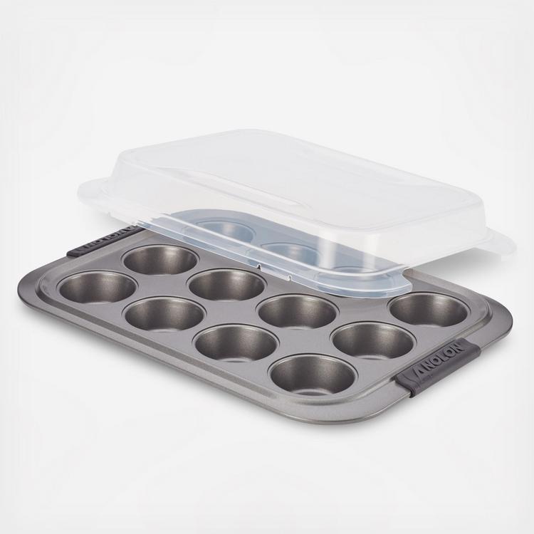 From morning muffins to birthday cupcakes, the Anolon Advanced Nonstick Bakeware 12-Cup Covered Muffin Pan with silicone handle grips helps make baking easier and more efficient. Anolon Bakeware is designed and constructed to measure up to the high standards of dedicated, creative home bakers, and the sleek graphite color of this nonstick muffin pan is medium-toned to aid in even browing. Use the muffin pan to prepare a dozen gluten-free blueberry muffins for brunch with friends or bake your own version of angel food cupcakes with orange-mascarpone frosting. Constructed of heavy-duty carbon steel, this muffin and cupcake pan resists warping and provides the even heat distribution fundamental to successful baking results. Inside and out, the graphite-colored nonstick coating provides optimum food release and easy cleanup. The wide rim and rubberized handles provide ample space for solid grip and comfortable grasp when transferring delicious cake layers to a cooling rack, even with bulky oven mitts. Best of all, the muffin pan is backed by the Anolon Lifetime Warranty. This product contains (Este producto contiene) PTFE (PFAS). For more information on PFAS or chemicals in this product, visit (Para obtener mas informacion sobre PFAS o productos quimicos en este producto, visite) anolon.com/pages/product-disclosures.