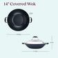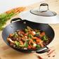 With generous size and a unique lid, the Anolon Advanced Indigo Hard-Anodized Nonstick 14-Inch Covered Wok offers ample room to toss and stir vegetables, tofu and meats to create delicious Asian-inspired meals. The wok's heavy-duty, hard-anodized construction provides even heat distribution for exceptional cooking performance, and the distinctive indigo exterior and rich chocolate interior add elegant design.