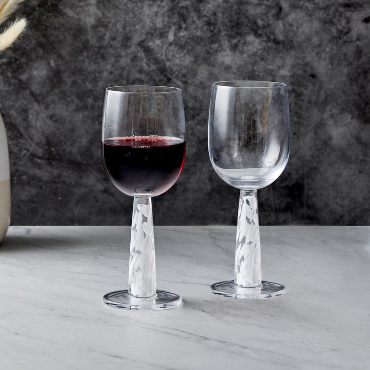 Sip your favorite wine in style with the Bjorn Wine Glass, Set of 2. The set features a sleek Scandi style with clean lines, well-rounded bowls, and a thick stem and foot plate. Made from a single column of solid glass, and is decorated with glass chips, to give each one a unique look creating Bjorn's signature design. The set also comes gift boxed, perfect for gifting or self purchase.