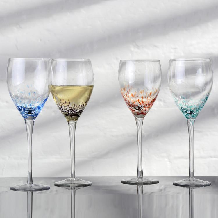 Cheers to Speckle! With four differently coloured glasses in each set, this trendy collection is perfect for a colourful dinner party. The unique mixture of coloured and glass beads creates a beautiful swirling effect in each glass. Mouth blown and handcrafted, these wine glasses are designed to impress. Comes in a smart gift box.