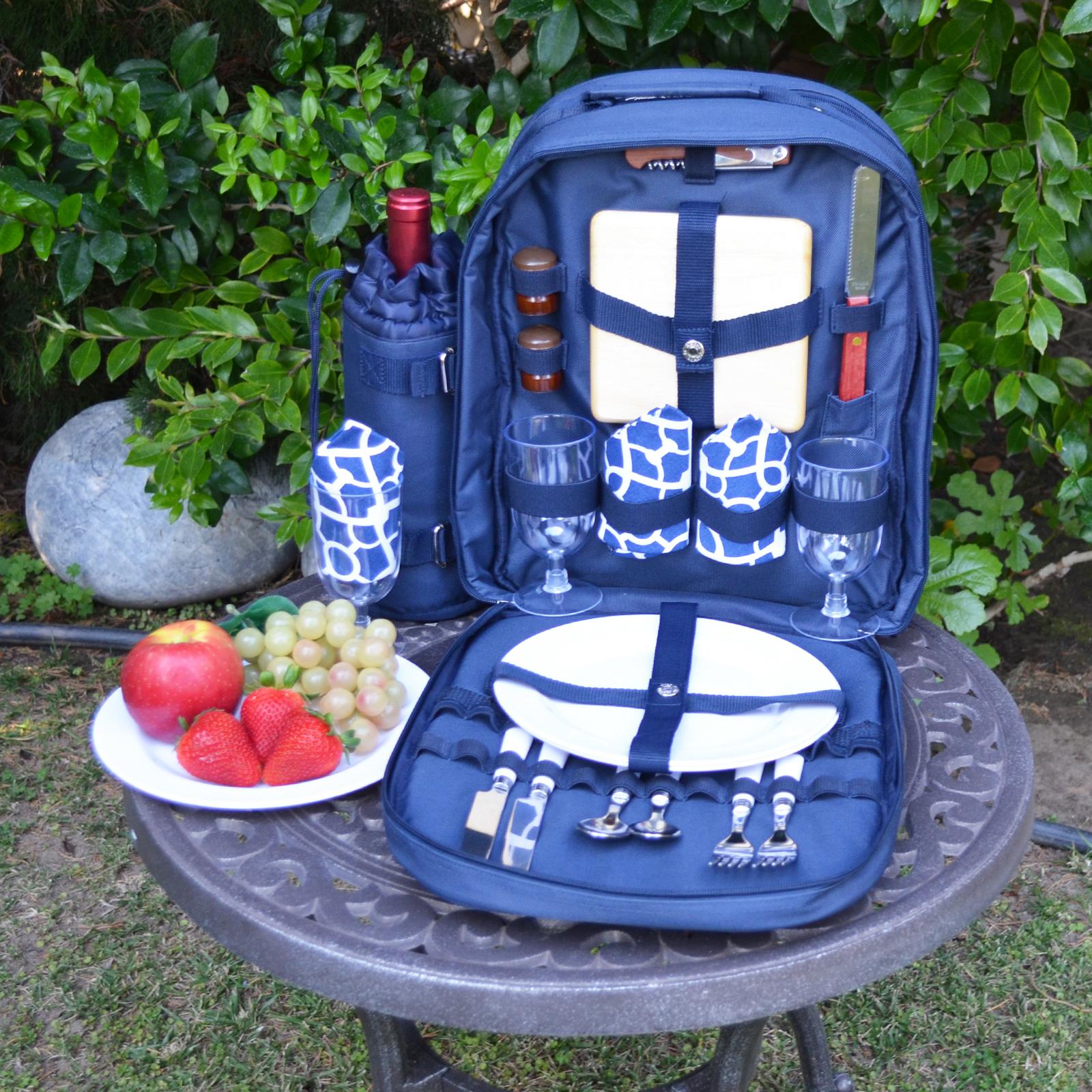 Fully equipped picnic backpack for two with detachable insulated wine holder and thermal shield insulated cooler section to keep food and drink at the perfect temperature.