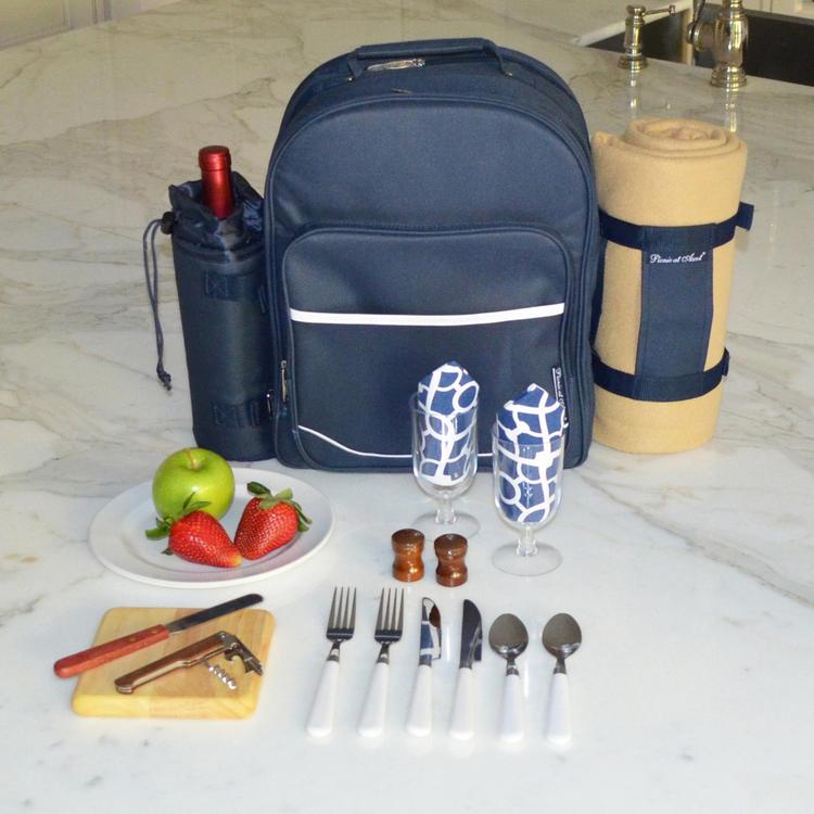 This all-in-one picnic backpack is perfect for couples who love to be spontaneous. It comes with a unique, divided Thermal Shield cooler feature, with separate sections for wine and food, and everything else you need for the ultimate picnic experience. Inside you will find a combination corkscrew, a hardwood cutting board, a cheese knife, wooden salt & pepper shakers with non spill tops, acrylic wine glasses, coordinating melamine plates, stainless steel flatware, cotton napkins and large fleece blanket. Que romantico!