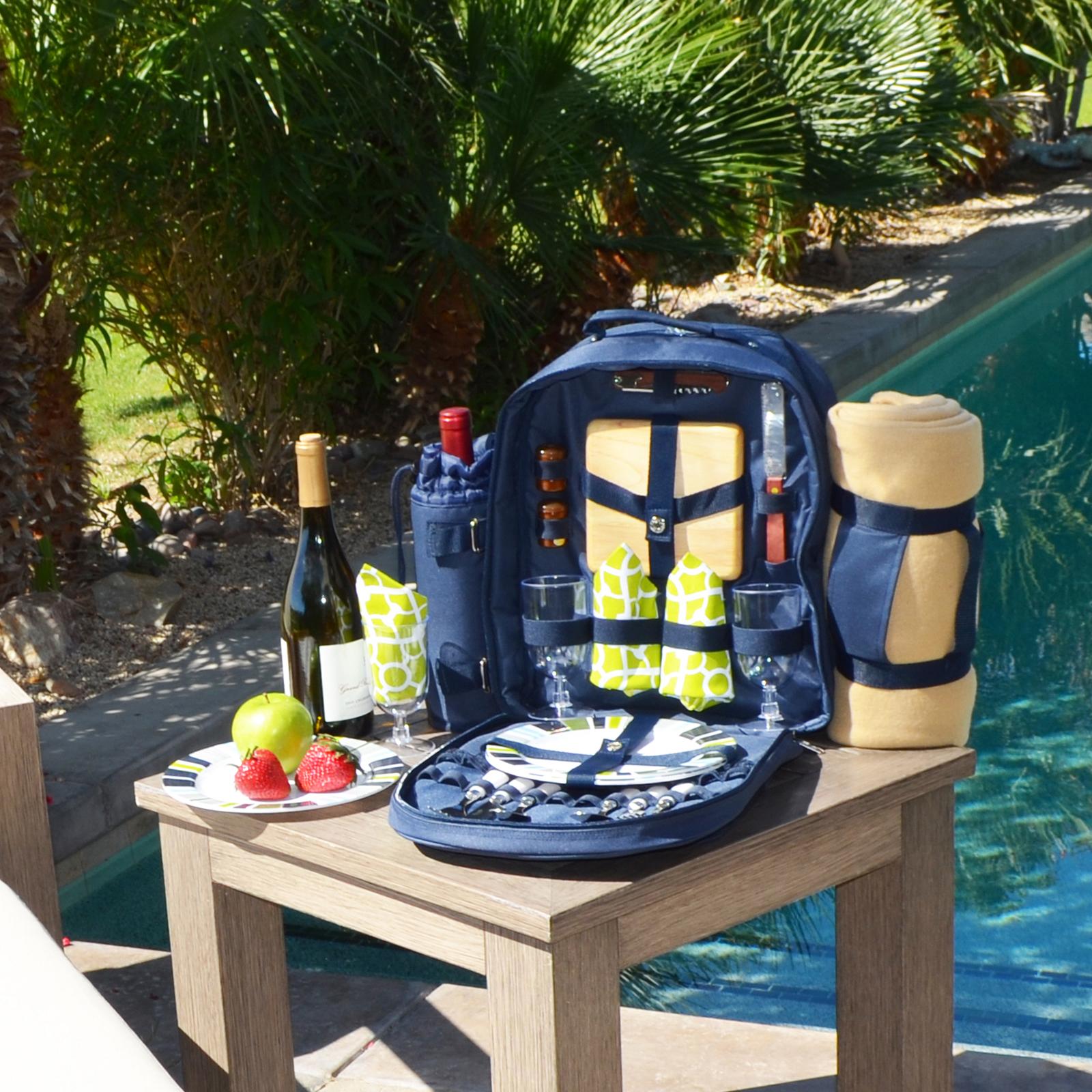 This all-in-one picnic backpack is perfect for couples who love to be spontaneous. It comes with a unique, divided Thermal Shield cooler feature, with separate sections for wine and food, and everything else you need for the ultimate picnic experience. Inside you will find a combination corkscrew, a hardwood cutting board, a cheese knife, wooden salt & pepper shakers with non spill tops, acrylic wine glasses, coordinating melamine plates, stainless steel flatware, cotton napkins and large fleece blanket. Que romantico!