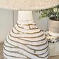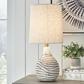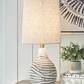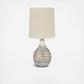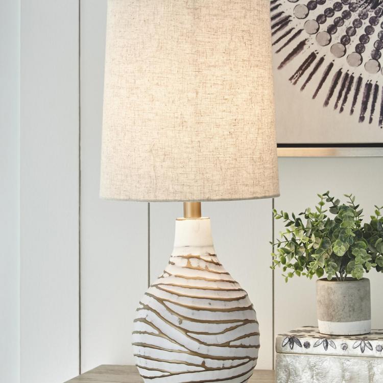 Shine a contemporary spotlight on your good taste with the Aleela lamp. The antiqued white and goldtone finish of this metal lamp add texture and interest to any space. With a modified drum shade, this light will illuminate your decor with style.