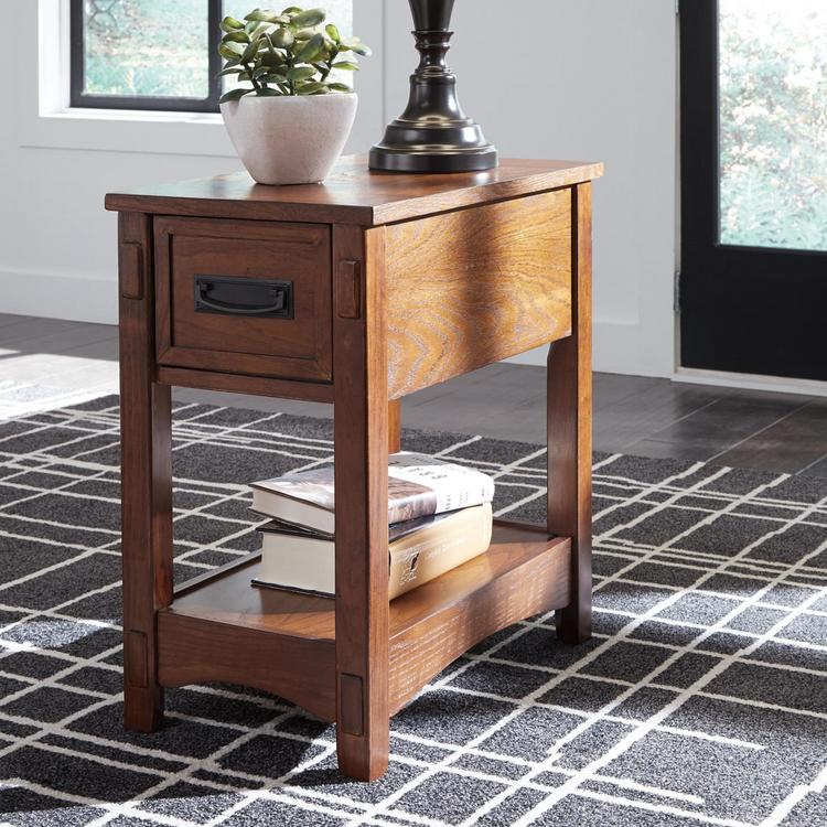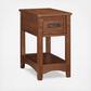 All the great elements of Mission-style design-including mortise-and-tenon decorative overlays—packed into an adorably sized chairside end table. Small but essential, this accent table includes a deep drawer with removable tray for handy storage.
