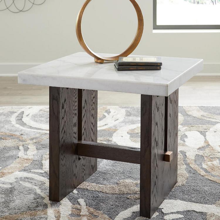 Dressed to thrill, this simply stunning End Table offers a high-design look at a down-to-earth price. Ultra-sleek lines are accentuated with a dark waxy finish that’s so easy on the eyes. Clean-lined and modern, the plinth base and natural marble tabletop showcase quality craftsmanship and attention to detail. This table is the perfect sofa companion for a living room or family space, with a timeless look that's made to last. Color variations, fissures, mineral deposits and veining in the marble top are naturally formed characteristics.
