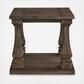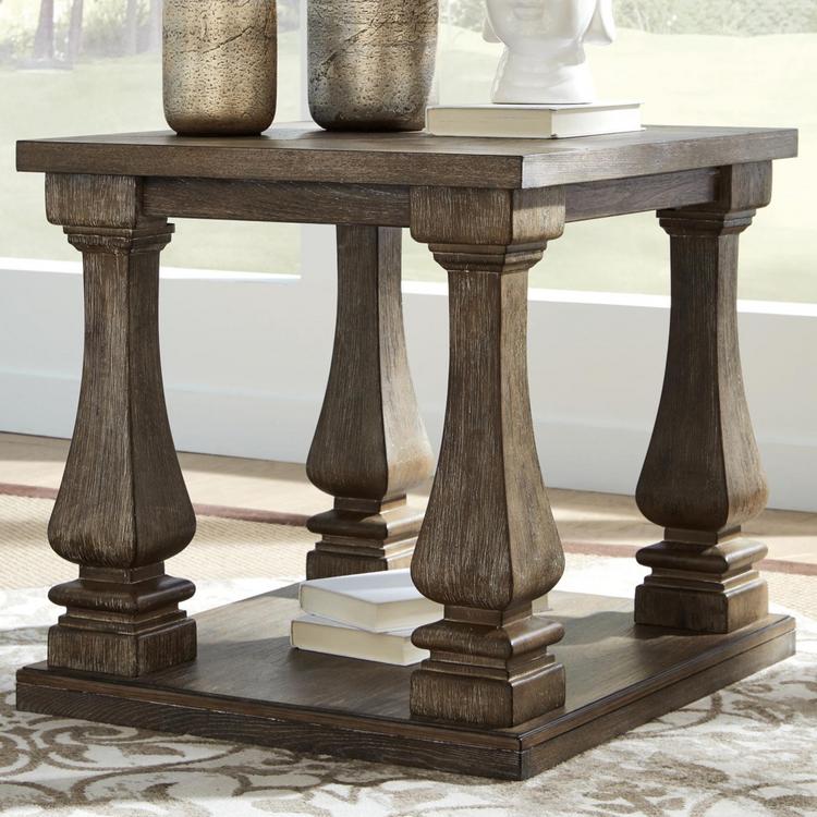 Homey. Hearty. Heavenly hued. Luring with a distressed weathered gray finish and square baluster legs set on a broad lower shelf for great presence, the Johnelle end table is sure to make your homestead feel that much more like home. The look is beautified with elm veneers and a framed and plank-effect tabletop for a richly crafted masterpiece made for years of satisfaction.