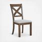 This upholstered dining chair elevates the art of casual rustic style. With a distressed nutmeg finish, antiqued nailhead trim and textured polyester fabric, this upholstered dining chair with classic X back styling entices with warmth and earthy elegance. Cushioned seat accommodates lingering meals enjoyed in comfort.