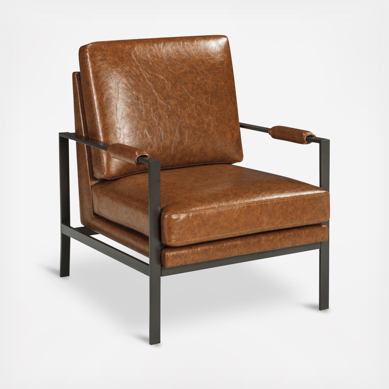 Find the perfect balance of high style and plush comfort with this accent chair. Ultra-linear metal frame and box seat cushion styling are sure to appeal to contemporary tastes. Weathered faux leather in a light brown tone give this cool chair a sense of warmth.