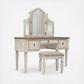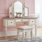 Elevating the art of traditional cottage styling, the Realyn 3-piece vanity set is your dream bedroom retreat realized. Antiqued two-tone aesthetic blends a chipped white with a distressed wood finished top for added charm. Framed drawer fronts and a plushly upholstered stool add refinement, while the tri-panel mirror lends a classic touch.