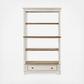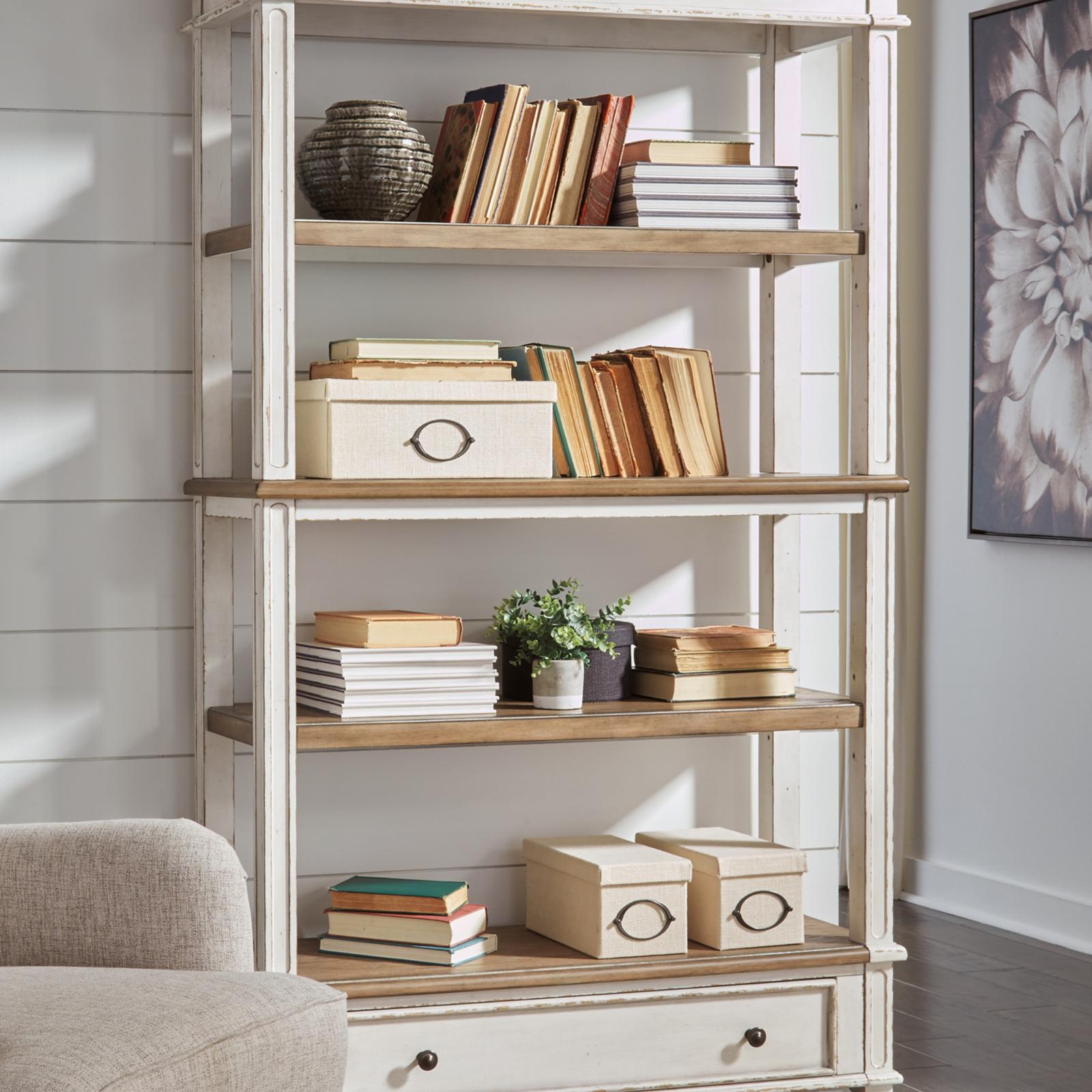 Elevating the art of traditional cottage styling, the Realyn bookcase is your heavenly home office realized. Antiqued two-tone aesthetic blends a chipped white with a distressed wood tone top for added charm. Clever balance of shelf and drawer space beautifully works.
