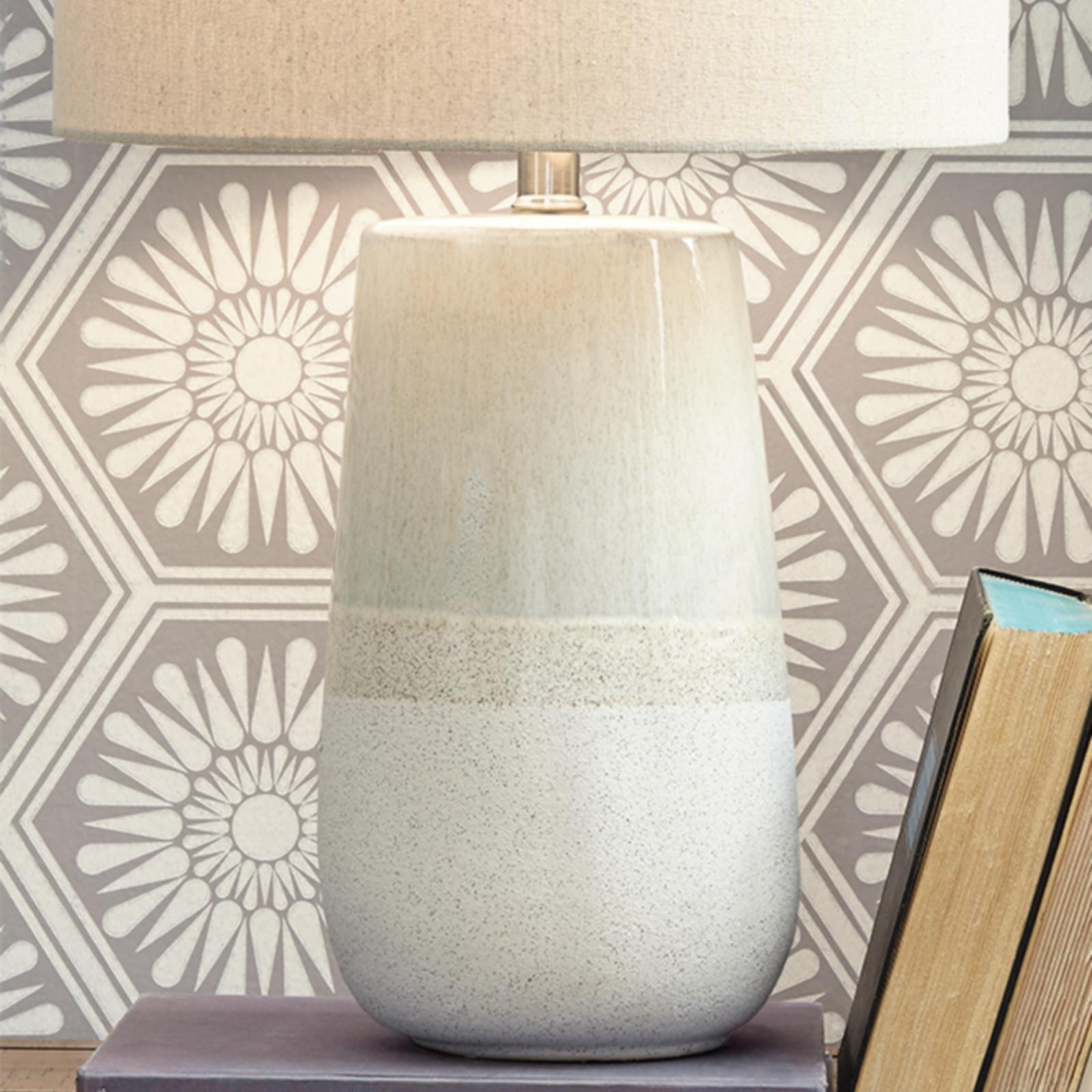 With a textured neutral glaze, the Shavon table lamp brings thoughts of sun, surf and sand to your space. Turn coastal chic to the contemporary side with this transitional lamp.
