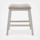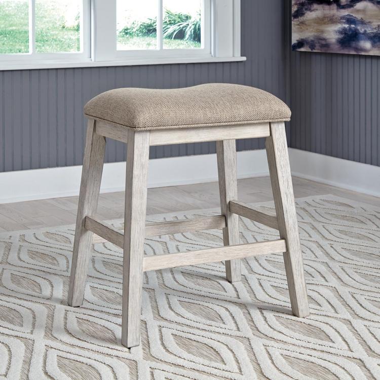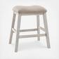 This upholstered stool invites you to raise the bar on small space living. An inspired choice for coastal chic or modern farmhouse settings, this comfortably cushioned stool sports a grayish white finish with rub-through effect for timeworn appeal.