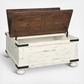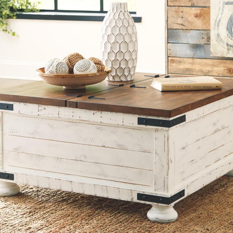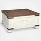 Double take. Sporting a two-tone finish, dual-sided lid design and expansive storage space, this square coffee table takes the art of rustic farmhouse living to a new level. Designer touches include plank-effect styling, heavy distressing and industrial bracket hardware.