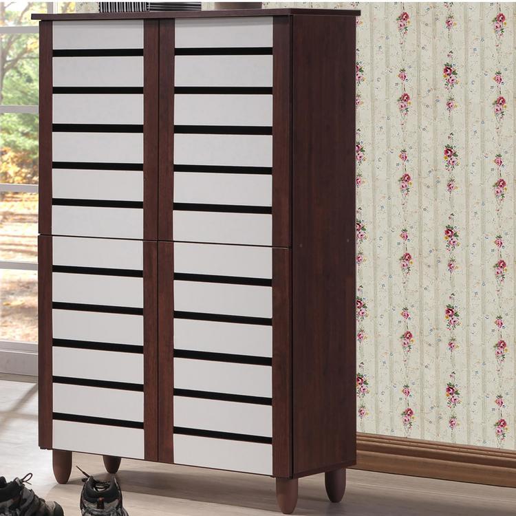With a compact and elegant design, the Gisela series shoe cabinets from Baxton Studio is perfect for houses with space constraints. Two-tone finish for a modern look in dark oak and white will blend in with a variety of décor schemes easily. Functional and beautiful, it makes for a great addition to your home. The shoe cabinet is solidly built with engineered wood in two-tone oak and white finishing. The shoe cabinet has six shelves with five fixed dividers , four doors and vinyl legs. Assembly is required.
