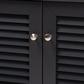 Store your shoes on the sly with the Coolidge shoe cabinet. Two slatted doors, fitted with round knobs, conceal four shelves with storage space for up to 12 pairs of shoes. Tapered legs add refined style and provide elevation to deter dust buildup. Constructed from engineered wood, the Coolidge showcases a sleek neutral finish that complements any color scheme.
