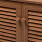 Store your shoes on the sly with the Coolidge shoe cabinet. Two slatted doors, fitted with round knobs, conceal four shelves with storage space for up to 12 pairs of shoes. Tapered legs add refined style and provide elevation to deter dust buildup. Constructed from engineered wood, the Coolidge showcases a sleek neutral finish that complements any color scheme.