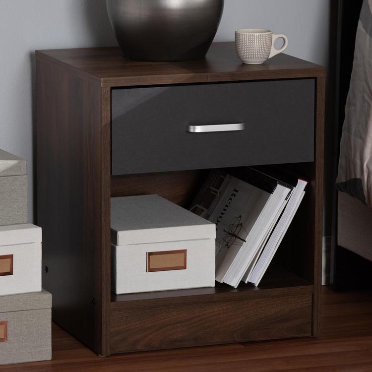 The handsome, minimalist Hansel 1-drawer nightstand will bring a striking presence to your bedside. The smooth, square silhouette is indicative of its modern and contemporary-inspired design. The Hansel's engineered wood frame is finished in a dark brown, with the face of its drawer finished in dark grey for a two-tone look. The nightstand features one pull-out drawer for bedside storage, and an open shelf space for added convenience. The silver, powder-coated finished drawer handle sharply complements the brown and grey finish of the Hansel. Add a smart, executive vibe to your bedroom or guest room with this nightstand. Assembly is required.