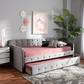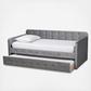 Set up an elegant environment for lounging and sleeping with the Jona daybed. This wooden daybed is upholstered in a soft, luxurious velvet fabric and padded with foam for the utmost comfort. Sleek track arms display a modern look, while button tufting lends a classic touch. Designed with both style and function in mind, the Jona is fitted with a roll-out twin size trundle bed to provide easy accommodation for overnight guests. Requiring assembly, the Jona is well suited for guest rooms and children’s rooms. Mattress not included.