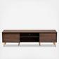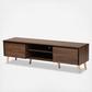 Organize your living room with the retro yet practical Landen TV stand. The Landen is comprised of a walnut brown finished wood frame equipped with two open shelves and two enclosed compartments to easily organize media devices and other items. Gold tone legs add a subtle touch of glamour. Requiring assembly, the Landen is fitted with splayed legs for a mid-century inspired aesthetic. Outstanding utility with an eye-catching design, the Landen TV stand is an exceptional addition to any home.