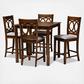Exquisitely crafted, the Lenoir pub set adds elegance to any dining space. This wooden pub set includes one table and four chairs, each upholstered in a light fabric that complements the walnut brown finish on the wood. Designed with both comfort and style in mind, each chair features a plush foam-padded seat, as well as an exquisite cut-out design on its back. Tapered feet add a classic, refined touch. Requiring assembly, this compact dining set is well suited for dining rooms and kitchens with limited space.