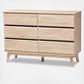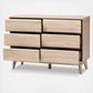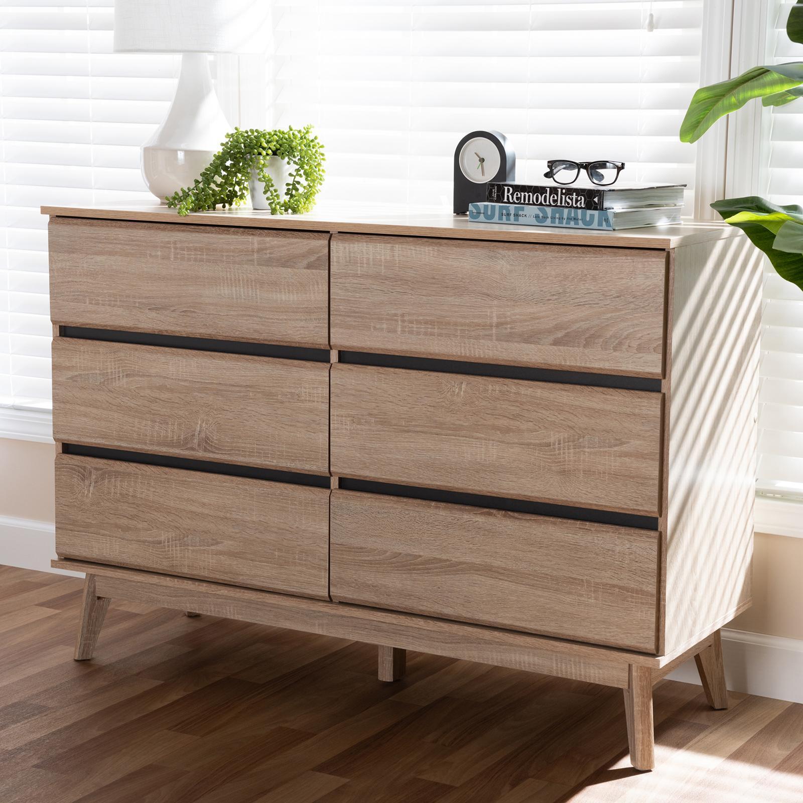 The simplicity and minimalist look of the Miren 6-drawer dresser make it a seamless addition to your bedroom or guest room. The sleek silhouette and angled, tapered legs of the dresser are hallmarks of its mid-century modern-inspired design. The Miren features an engineered wood frame finished in a light oak brown, with dark grey finishing between the drawers for a subtly contrasting color scheme. The dresser's five drawers pull forward from the top on sliders. The Miren's simple-yet-chic look make it easy to coordinate with your existing decor. The under clearance area beneath the dresser make it easier to clean underneath it. Assembly is required.