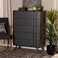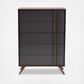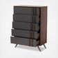With an ultra-modern, two-tone finish and ample storage space, the Naoki chest is sure to make an impression in any space. This wood chest features five spacious drawers to store clothes, linens, and more. Each drawer is fitted with metal glides for smooth movement. A two-tone grey and walnut finish are paired with long, double vertical handles for a cool, contemporary look. Requiring assembly, the Naoki chest is supported by splayed legs that create a chic, retro profile.