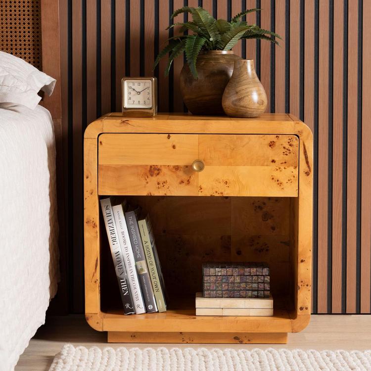 The Netra nightstand illustrates the raw beauty only endowed by nature. This modern piece consists of real natural burl wood. The drawer and open shelf adeptly organize bedside essentials, reserving the tabletop for nightly use. The Netra will arrive fully assembled and showcases the rich knots and rolling grain unique to burl wood, resulting in no two pieces being exactly alike. The round, metal drawer pull stands out brilliantly against the wood, making the Netra nightstand an incredible bedroom fixture.