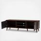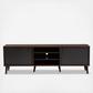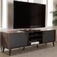 Organize your entertainment space in style with the Samuel TV stand. The modern and contemporary-inspired design elements come through in the straight lines and solid colors of the television stand. The Samuel's engineered wood frame is finished in brown with dark grey finished doors. This TV stand features five shelf spaces, three of which are in the center, with one space on each side behind a door. The back panel of the Samuel has circular cut-outs for wire management, making it easy to arrange and store your gaming consoles and media players. The TV stand rests on stylishly angled, tapered legs. Add some chic and sophisticated style to your livingroom or rec room with the Samuel TV stand. Assembly is required.