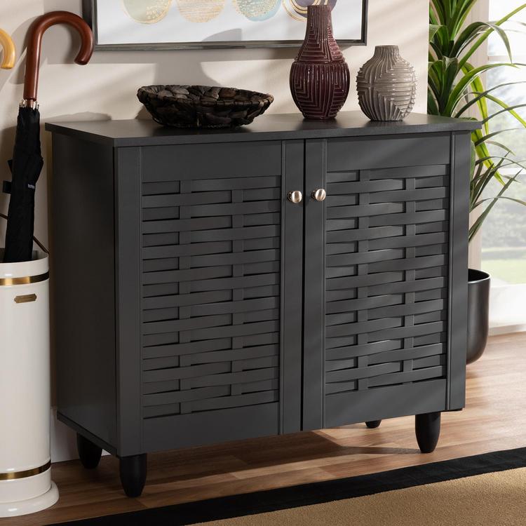 Keep your shoes organized and out of sight with the Winda cabinet. Featuring a stylish contemporary design and dark grey finish, the Winda is easy to coordinate with any style of decor. Two doors conceal two shelves with storage space for up to nine pairs of shoes. Slits are embedded within the doors to enable air circulation and prevent mold growth on your shoes. The Winda cabinet is made in Malaysia and requires assembly.
