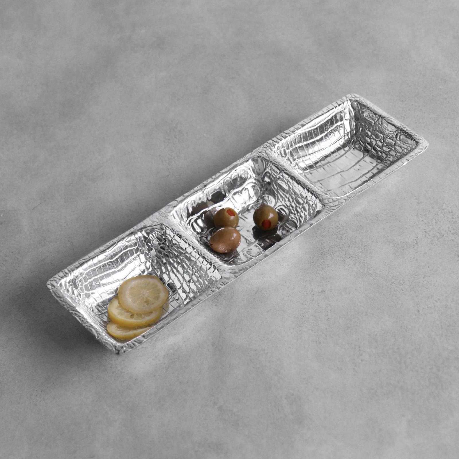 The latest additions to popular PIELES Croc Collection are sophisticated, rich in textures, and add cool modern décor to any table. They make a luxurious grouping for the bar, too. The PIELES Croc triple dip, in Beatriz Ball's signature sand-cast metal, is alive with realistic surface detail, and is beautifully hand-polished to a brilliant shine. With three generous wells, the piece is perfect for cocktail garnishes like cut lemons, limes and olives. Great for snacks and condiments, too! Intensely handmade products use eco-friendly and sustainable materials and are crafted by artisans who trace a heritage of metalworking for generations. Made of a top quality, FDA safe, easy-care, oven and freezer friendly aluminum alloy.