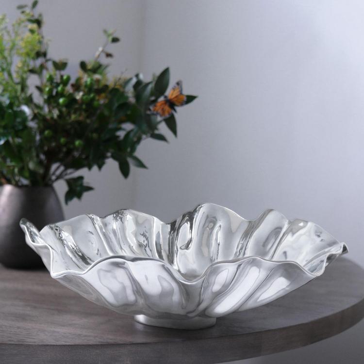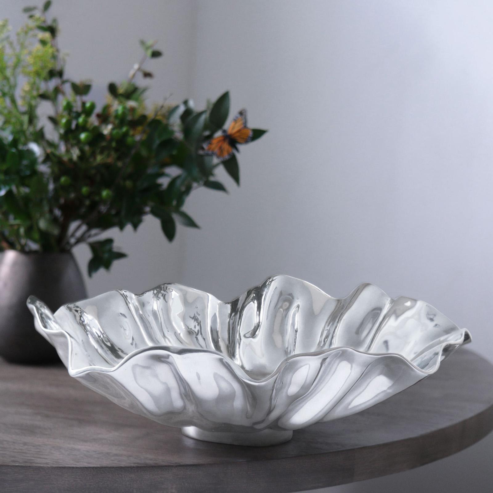 The Bloom Collection comprises sculptural bowls and platters inspired by floral and botanical forms that are beautiful as well as functional. As with the other Bloom pieces, the dynamic design of the VENTO Bloom Bowl in polished metal features rippling petal-like movement, creating an eye-catching serving vessel that combines beauty, artistry and functionality in equal measure. Great on its own, or combined with other Bloom shapes and sizes. A large bowl that enhances anything served in it. Intensely handmade products employ eco-friendly and sustainable materials, and are crafted by artisans who trace a heritage of metalworking for generations. An original design, sustainably handmade of a top quality, FDA safe, easy-care, oven and freezer friendly aluminum alloy.