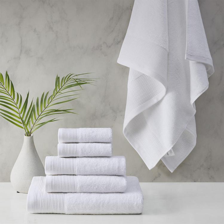 Refresh your bathroom with the luxurious and eco-friendly Nuage Tri Blend Antimicrobial 6 Piece Towel Set.