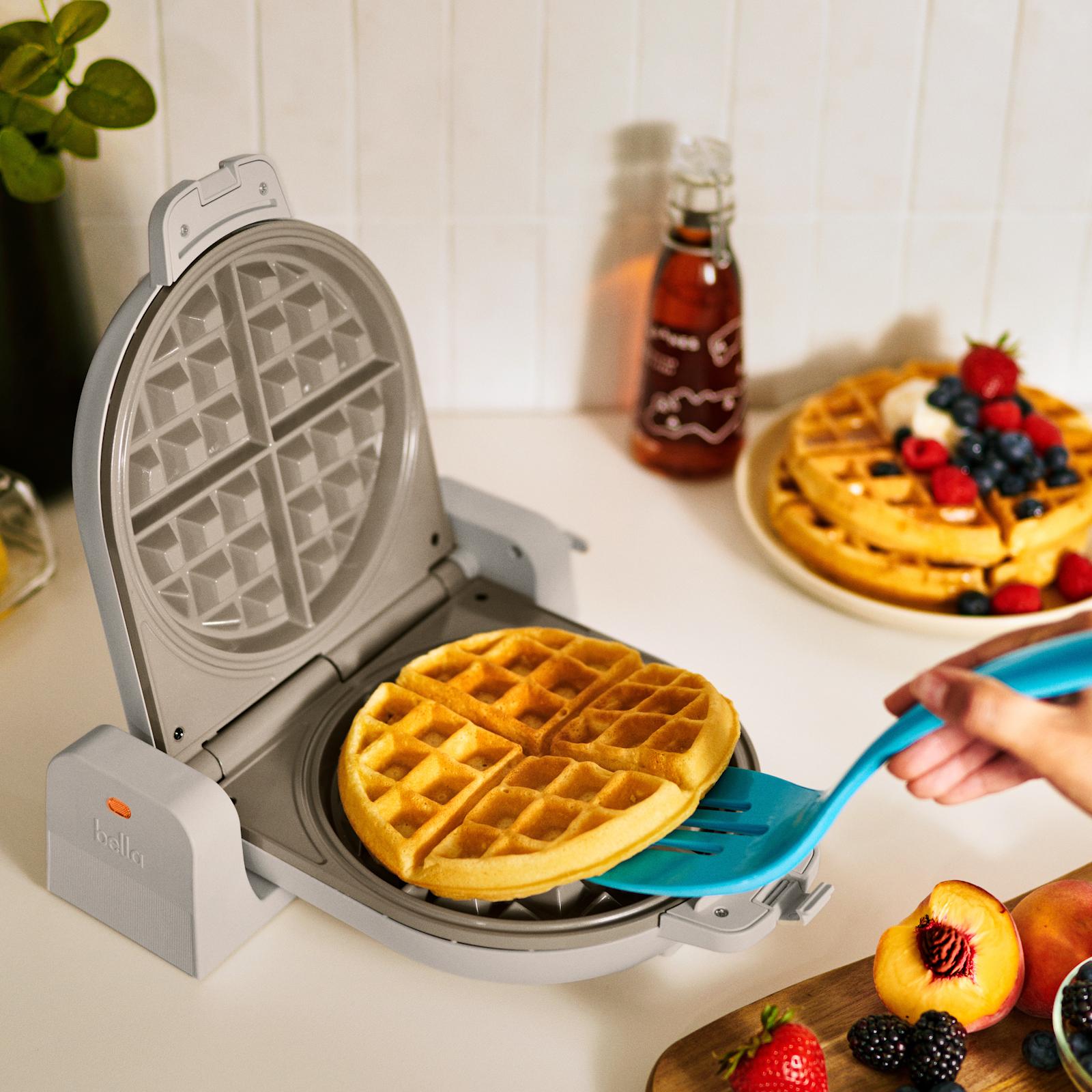 Our innovative hinge design flips waffles for even heating, in half the space than a bulkier rotating waffle and can be stored upright.