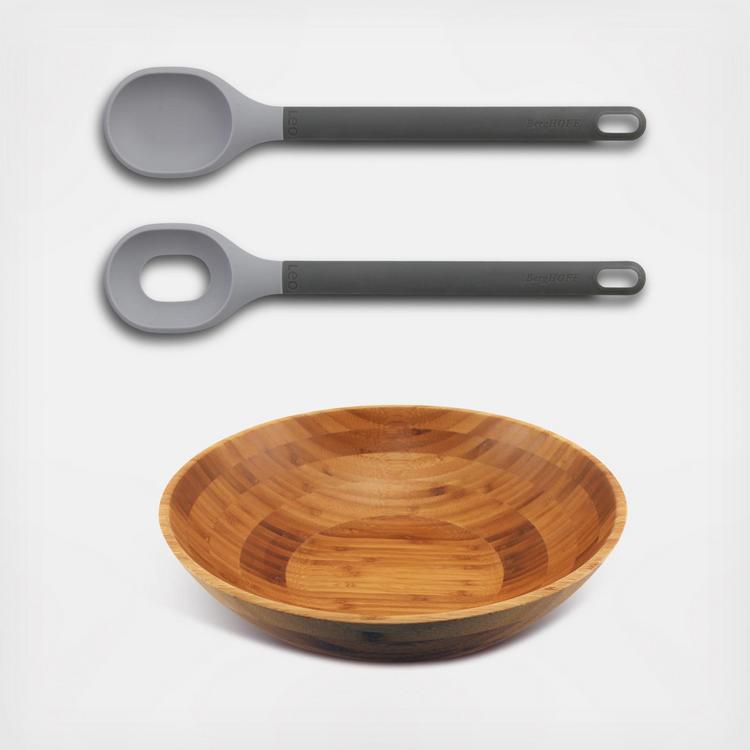 3-Piece Salad Serve Set is perfect for serving everything from individual salads, game day chips, and movie night popcorn. Salad bowl, both stunning and functional, is crafted from eco friendly bamboo. It's earthy natural bamboo color goes well with many home decor options. The beautiful muted Leo salad servers have long soft grip handles to easily toss and gather all the delicious vibrant salad layers. Servers are made from heat resistant silicone and can also be used for food prep on the stovetop.